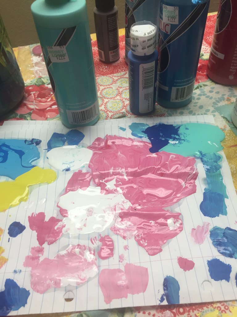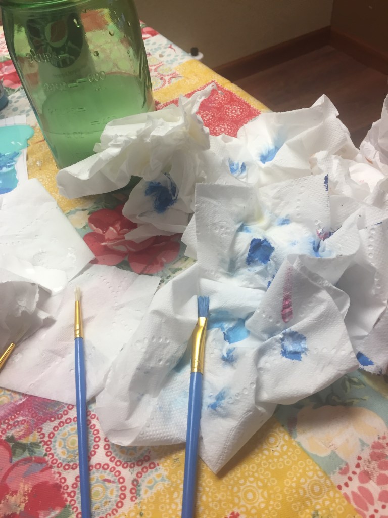 I found one that I decided to try. I have to be honest here, I didn’t have anything fancy when I began. I used notebook paper for my palette, my paint colors were slightly incorrect, and since I was out of paper towels, I substituted toilet paper for wiping brushes. Not glamorous by any means, but hey, it worked!
