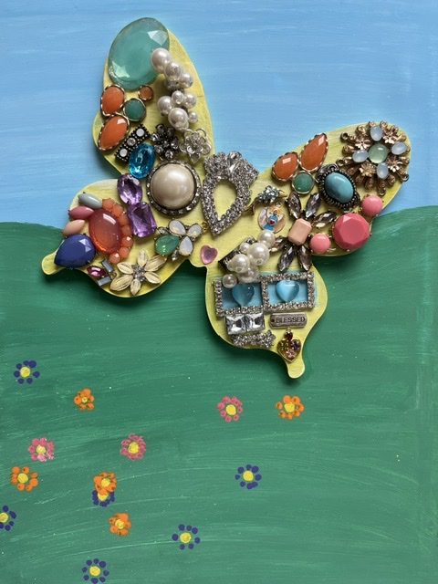 I had a wall canvas that didn’t quite fit my space anymore, so I painted it, added a butterfly and jewelry, and now I love it again.