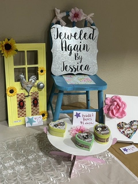 Such a cute display! I love your metal “Jeweled Again by Jessica” sign. The trinket boxes are adorable.