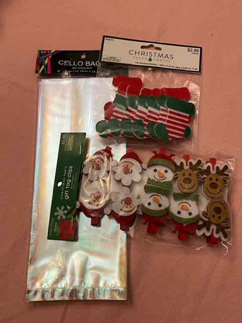 Lastly, Christmas items were 60-70% off, so I decided to get some things to wrap them in when finished. The bags are clear so they’ll be able to see their gift without having to open it right then. The stickers, clips, and ribbons will make fun accents.